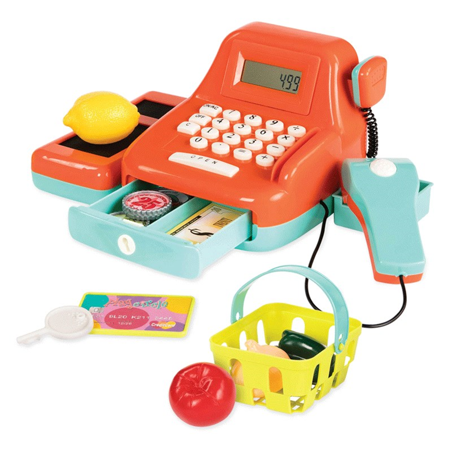 Işıklı tarayıcıyı ve tipik Ding'i kullandığınızda eğlenceli bir bip sesi duyuyorsunuz. Günlük spesiyalleri duyurmak için taklit mikrofonu kullanın. Hesap makinesi çalışmaktadır ve gerçekçi sesler çıkarır. Battat Yazar Kasa, gerçek bir dükkan sahibi olmak gibidir. Sosyal ve ince motor becerileri geliştirilmesine yardımcı olur. 2 x AA pil dahildir.